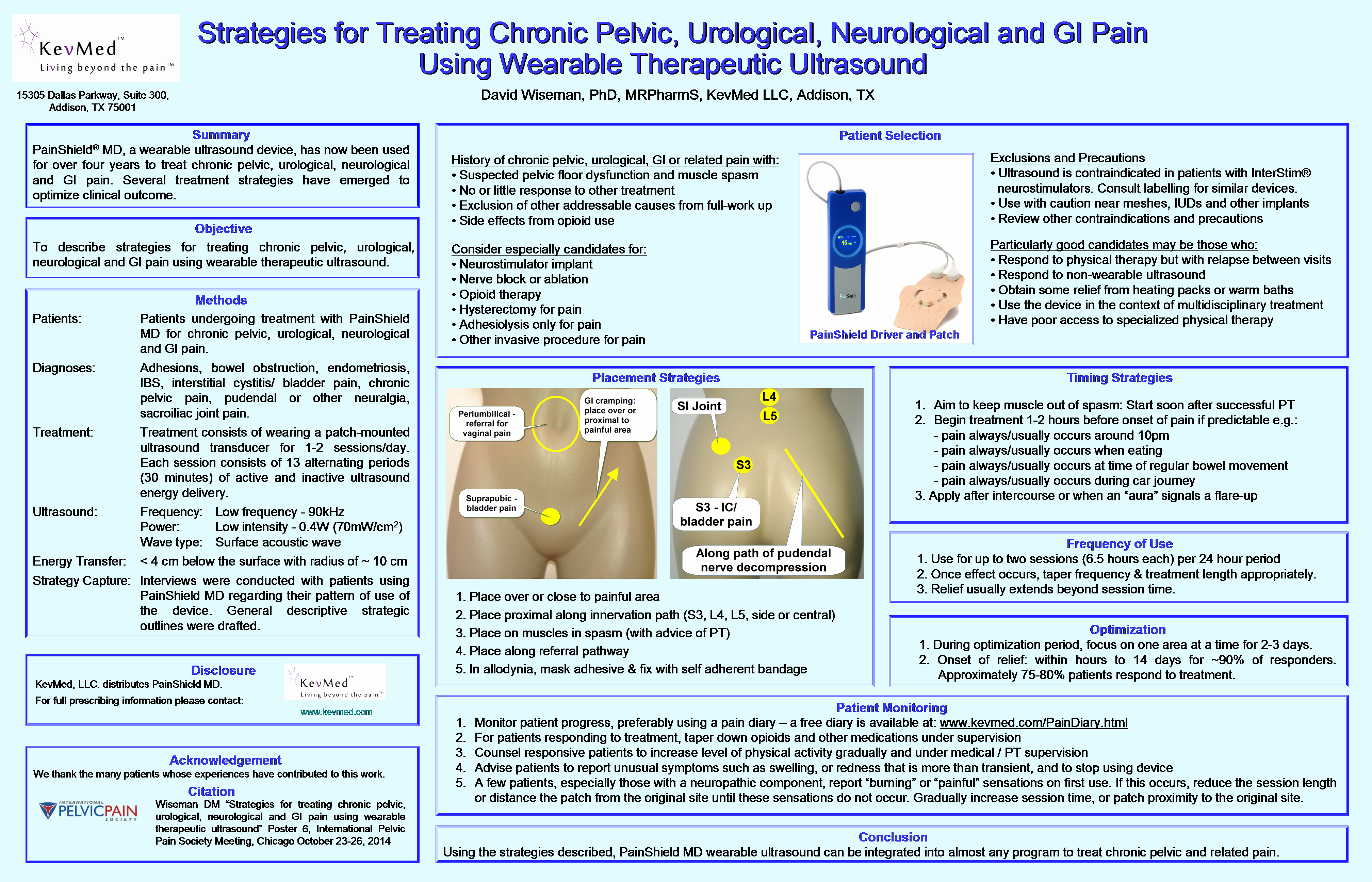 Summary: PainShield MD, a portable, wearable ultrasound device was found to reduce pelvic, urological pain and related symptoms in 19 patients presenting with long−standing and refractory symptoms. Click here for full abstract (presented at the International Pelvic Pain Society Meeting, Chicago, 2012)
